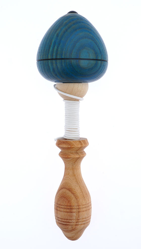 A large robust fast spinning top with a metal tip and pull string, designed to be used on all surfaces including outdoors. Wind it up, push the starter cap down gently, pull the string and watch it take off spinning and bouncing across even rough surfaces. You can pick it up mid spin and throw it around and it just keeps on going! This one comes in a lovely rich blue stain with natural wood starter cap.