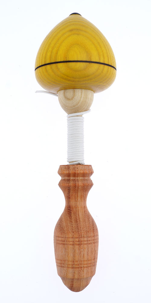A large robust fast spinning top with a metal tip and pull string, designed to be used on all surfaces including outdoors. Wind it up, push the starter cap down gently, pull the string and watch it take off spinning and bouncing across even rough surfaces. You can pick it up mid spin and throw it around and it just keeps on going! This one comes in a lovely bright yellow stain with natural wood starter cap.