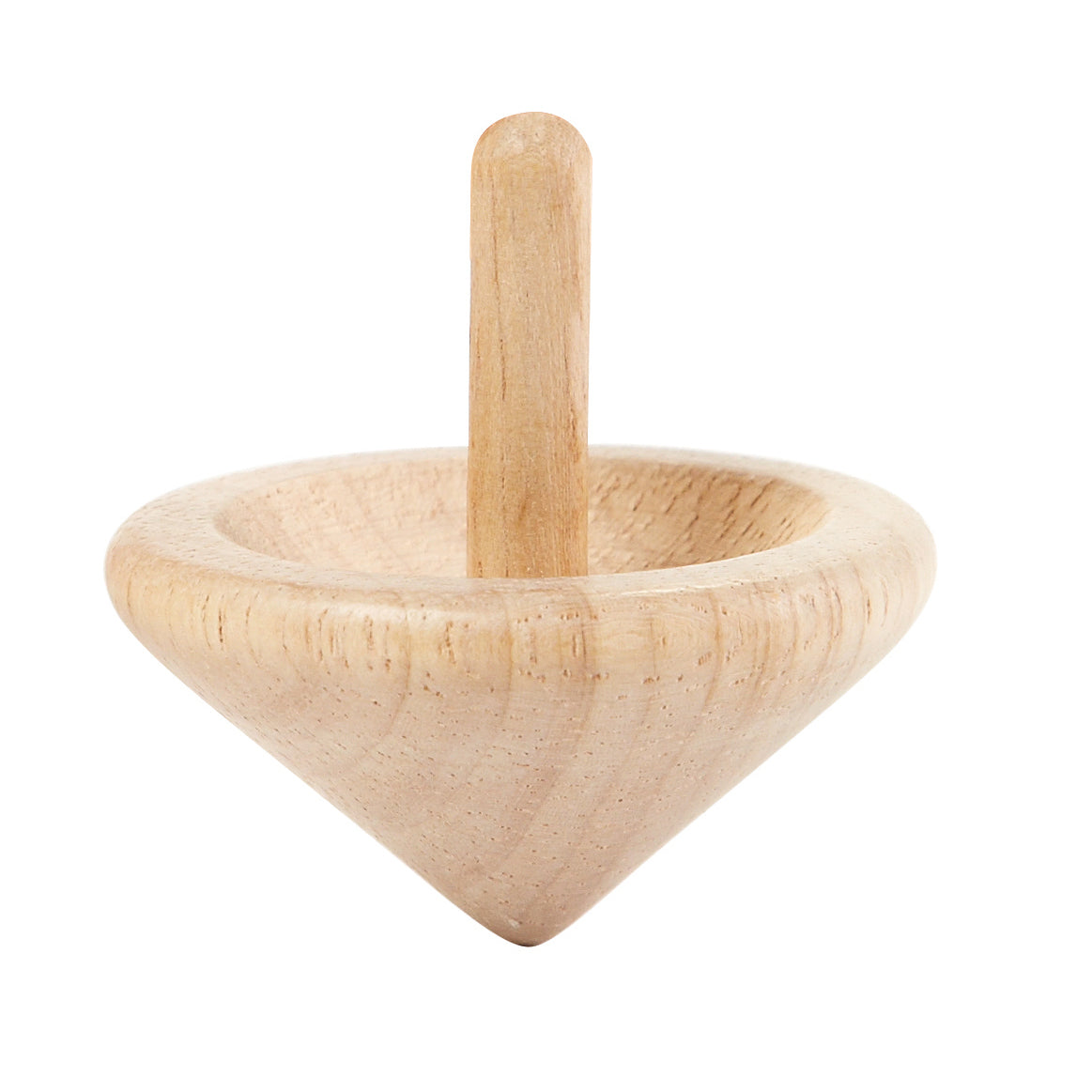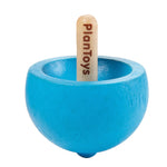 A child holding the PlanToys Mini Spinning Tops in their hand on a wooden table top