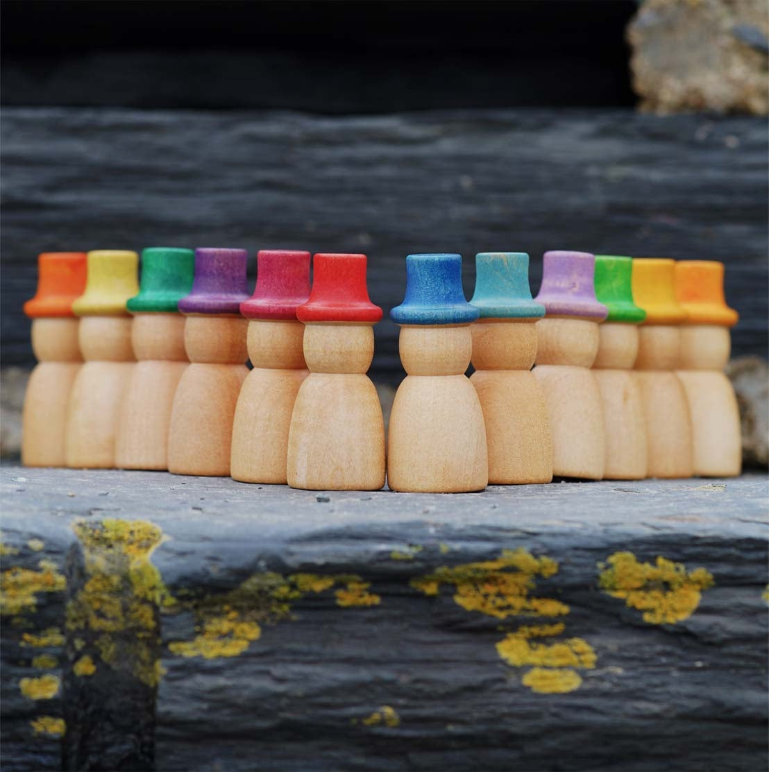 These Grapat Magos® are just delightful. beautiful natural wood with an explosion of rainbow colours on their heads. This is a short run limited edition product made by the hands of one of our favourite toy makers. Waldorf peg dolls will invite and foster a wonderful world of story-telling, involving a whole host of characters, from station master, to pirate, to gnome to flower fairy. These sustainable and open-ended Grapat peg dolls are presented without gender or expression, allowing your child's language to develop and for their imagination to take control.