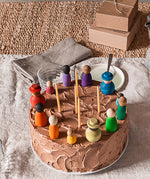 The Grapat Together set are classic Waldorf style wooden peg dolls, free from expression or facial features giving your child freedom to explore their imagination. The set comprises twelve figures, three baby Nins, three wide Nins with hats, three narrow Nins, and three striped Nins - twelve figures of differing shapes, colours, skin tone and design. Decorated thoughtfully with vibrant rainbow tones that will be loved by children of any age. The wood grain is wonderfully tactile and appealing to the senses. Explore imaginary worlds together, where your child can take you on a magical journey that offers limitless possibility. The Together set will offer endless play opportunities and many years of enjoyment, for both children and adults alike. Perfect for open ended play, colour matching, counting, small world play, and much much more.