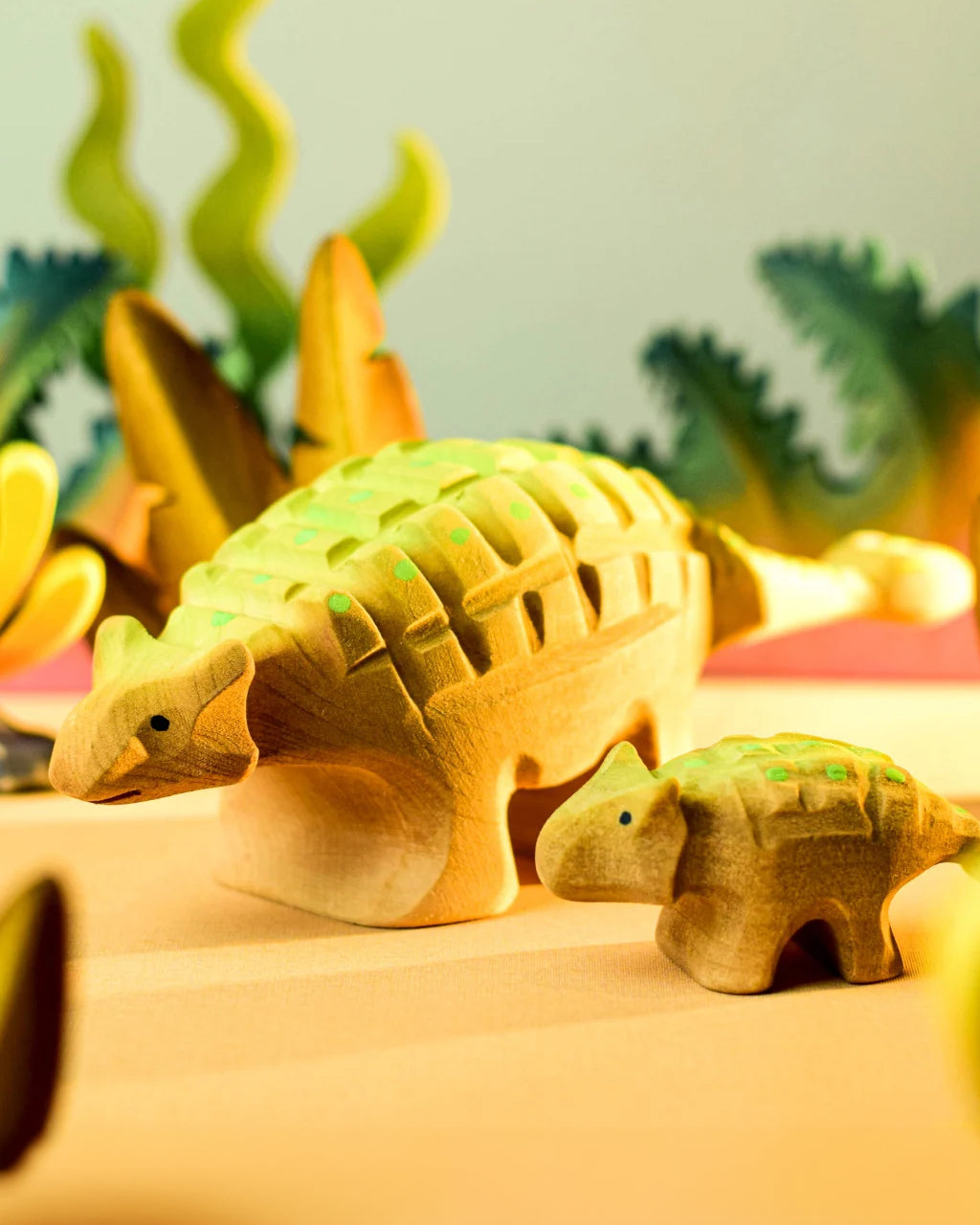 The gentle Baby Ankylosaurus by Bumbu is a wooden dinosaur figure for small world play, handmade and beautifully painted in shades of lime green with a classic club tail. An iconic Cretaceous herbivore, toddlers and children will adore this adorable baby wooden Ankylosaurus for display and imaginative play.