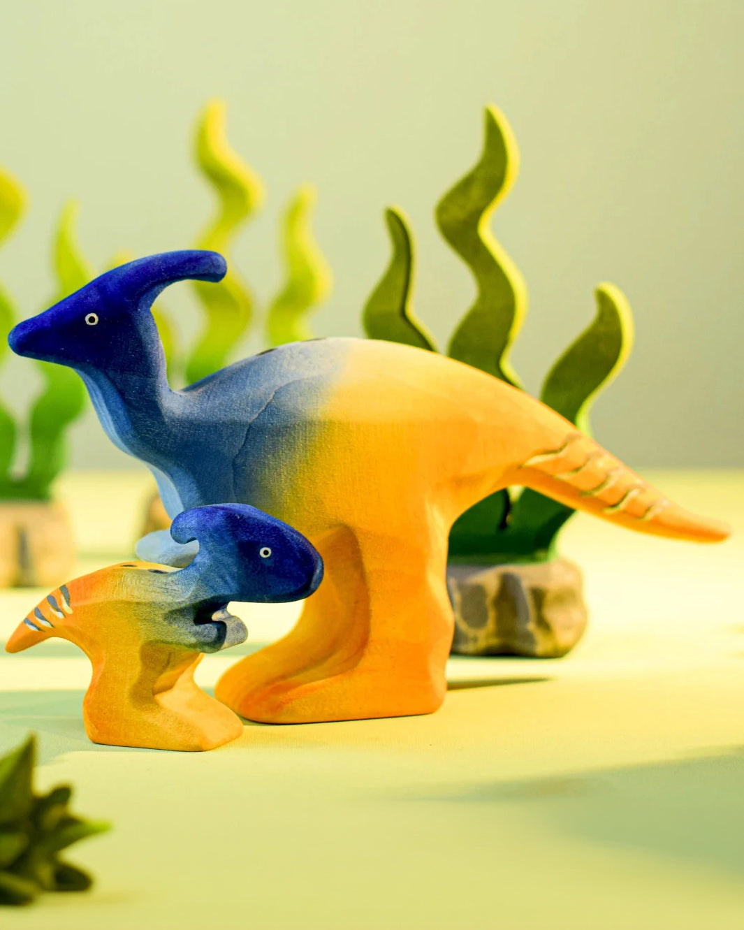The gentle Baby Parasaurolophus by Bumbu is a wooden dinosaur figure for small world play handmade and beautifully painted in shades of blue and yellow a characteristic bony headcrest. A peaceful herbivore from the Cretaceous, toddlers and children will adore this mini wooden Parasaurolophus for display and imaginative play.
