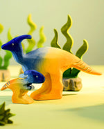 The duck-billed Big Parasaurolophus by Bumbu is a wooden dinosaur figure for small world play handmade and beautifully painted in shades of blue and yellow a characteristic bony headcrest. A peaceful herbivore from the Cretaceous, toddlers and children will adore this wooden Parasaurolophus for display and imaginative play.