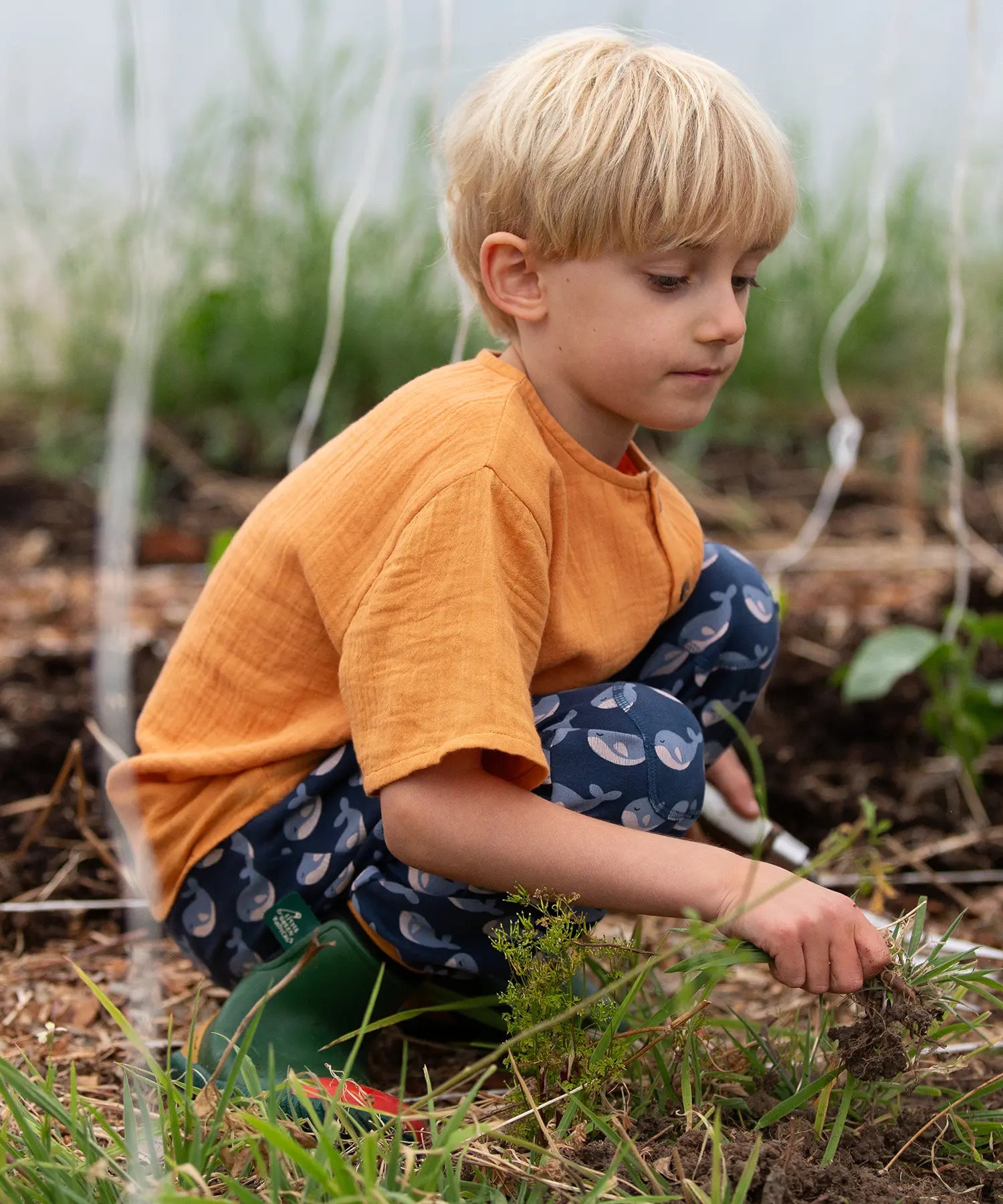 Child wearing the Little Green Radicals navy singing whales print comfy organic cotton joggers with a yellow muslin henley t-shirt and green and red wellingtons.