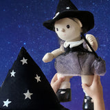 Olli Ella Wendy Witch dream Dinkum doll. A dinkum doll with a black dress, witches hat, black shoes and a magnetic broom accessory. This doll is part of Olli Ella's Halloween collection available here at Babipur.