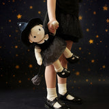 Wendy the friendly witch is a poseable Dream Dinkum Doll by Olli Ella. She has little black pigtails poking from under her velvety, star-covered witch hat. Her removable dress features a collared velvet bodice and a glittery mesh skirt, and she has sparkly black shoes. Her little broomstick really brings her witchy costume together.