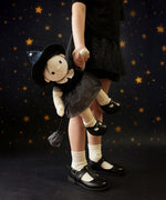 An Olli Ella Wendy Witch dream Dinkum doll in a seated position shown without her hat. A dinkum doll with a black dress, witches hat, black shoes and a magnetic broom accessory. This doll is part of Olli Ella's Halloween collection available here at Babipur.