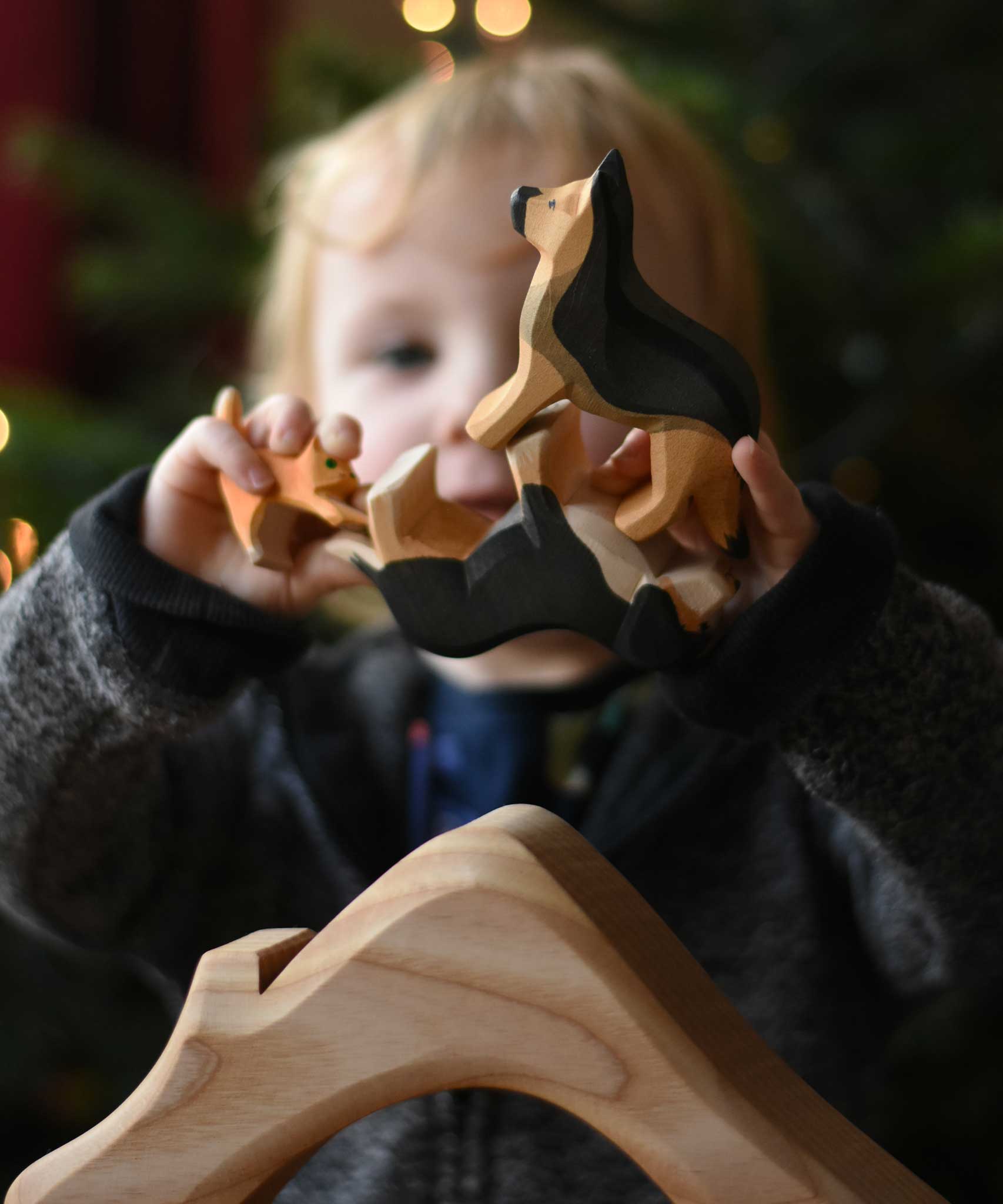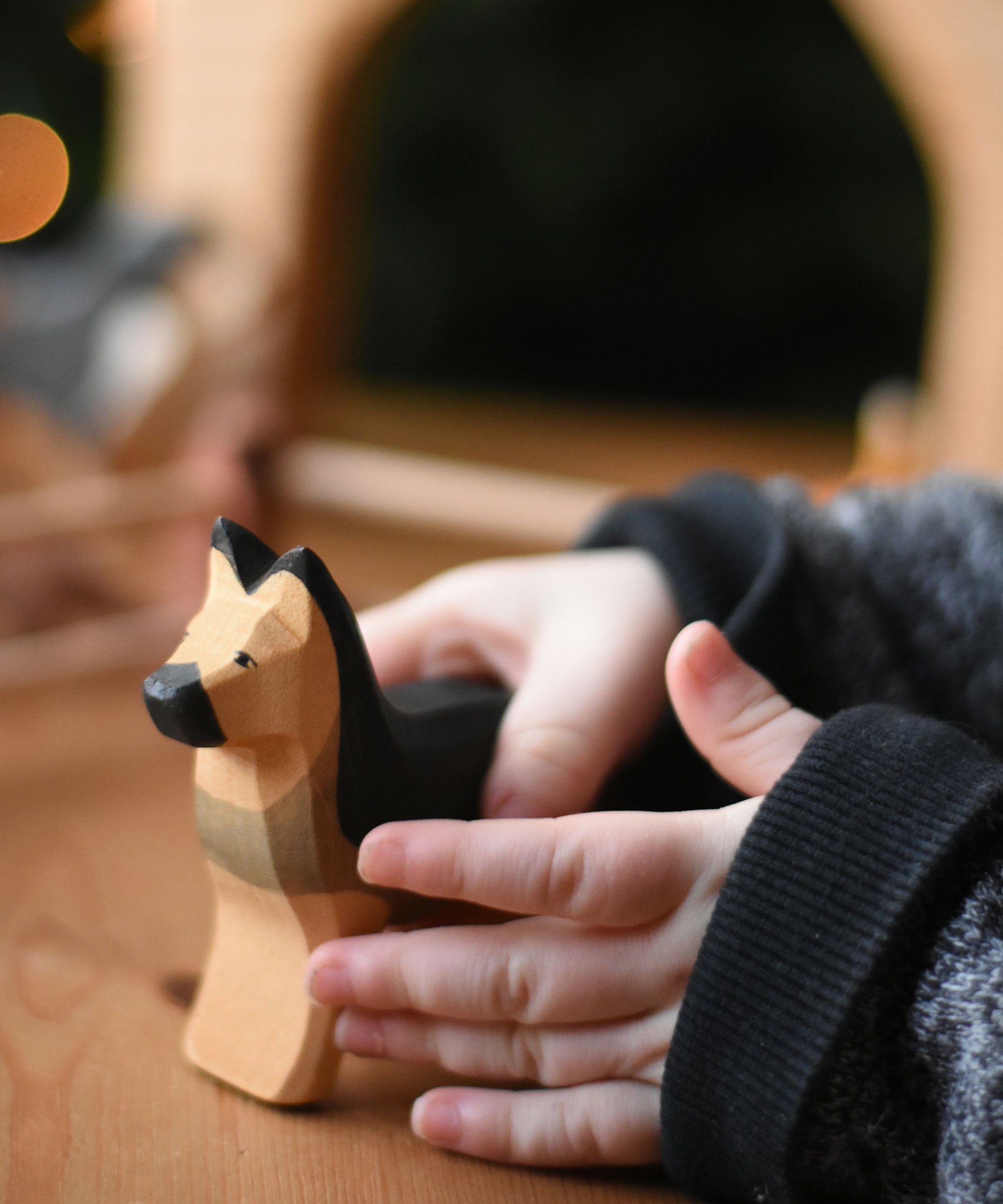 A child playing with an Ostheimer German shepherd dog wooden toy figure. These wooden figures are part of a wide range of expertly hand crafted wooden toys here at Babipur.