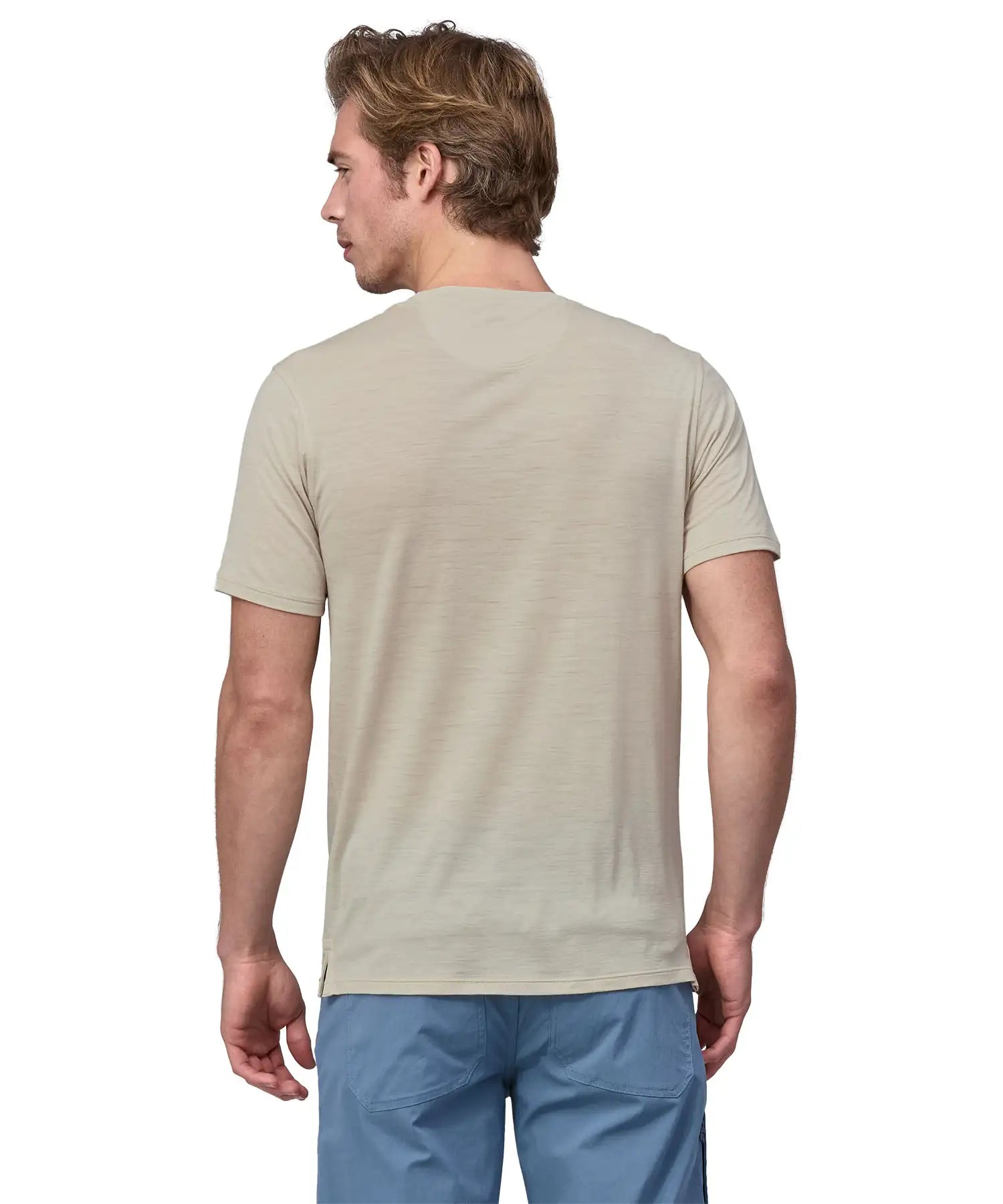 Man wearing a Patagonia men's Capilene Cool merino blend shirt in a cream colour.