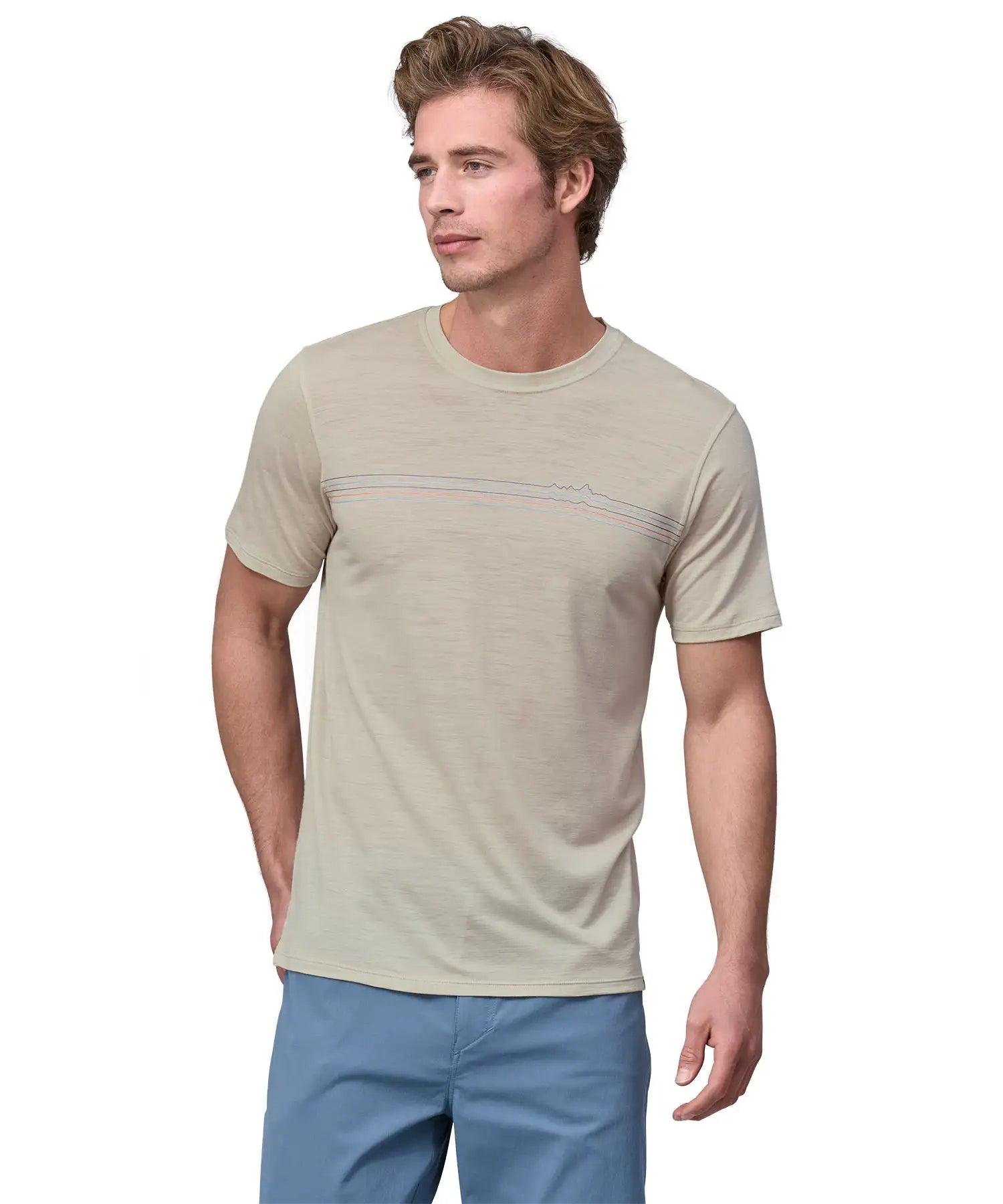 Patagonia men's capilene cool merino blend short sleeve t-shirt in blue with mountain graphic along the upper front body