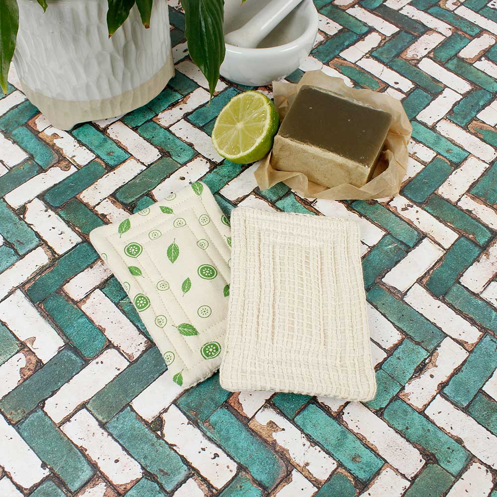 These 2 pack of organic cotton household scrubbing cloths by A Slice of Green are a low waste and plastic free way of cleaning the household from stubborn dishes to a deep bathroom clean. With a gorgeous mint leaf design on the smooth side, switch the single-use plastic sponges and scourers for a natural reusable kitchen cloth.