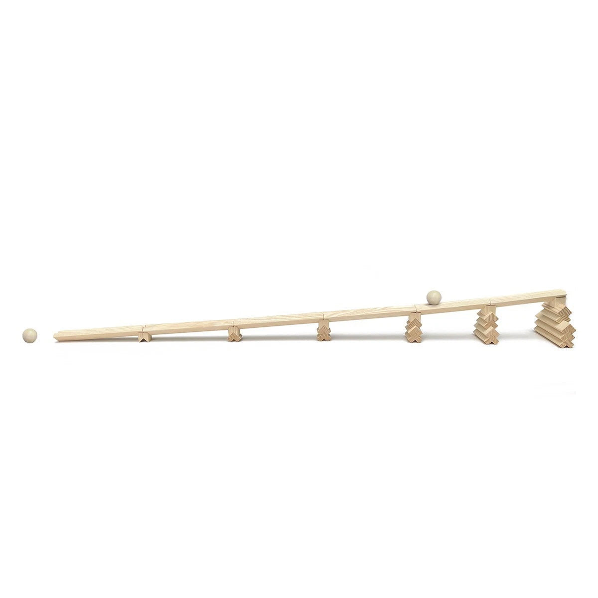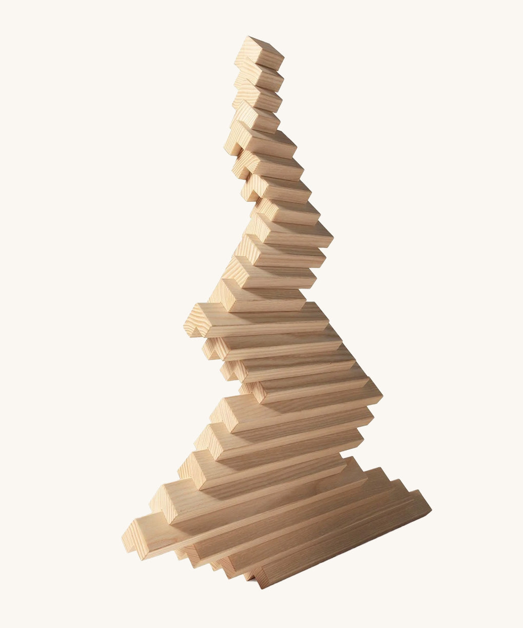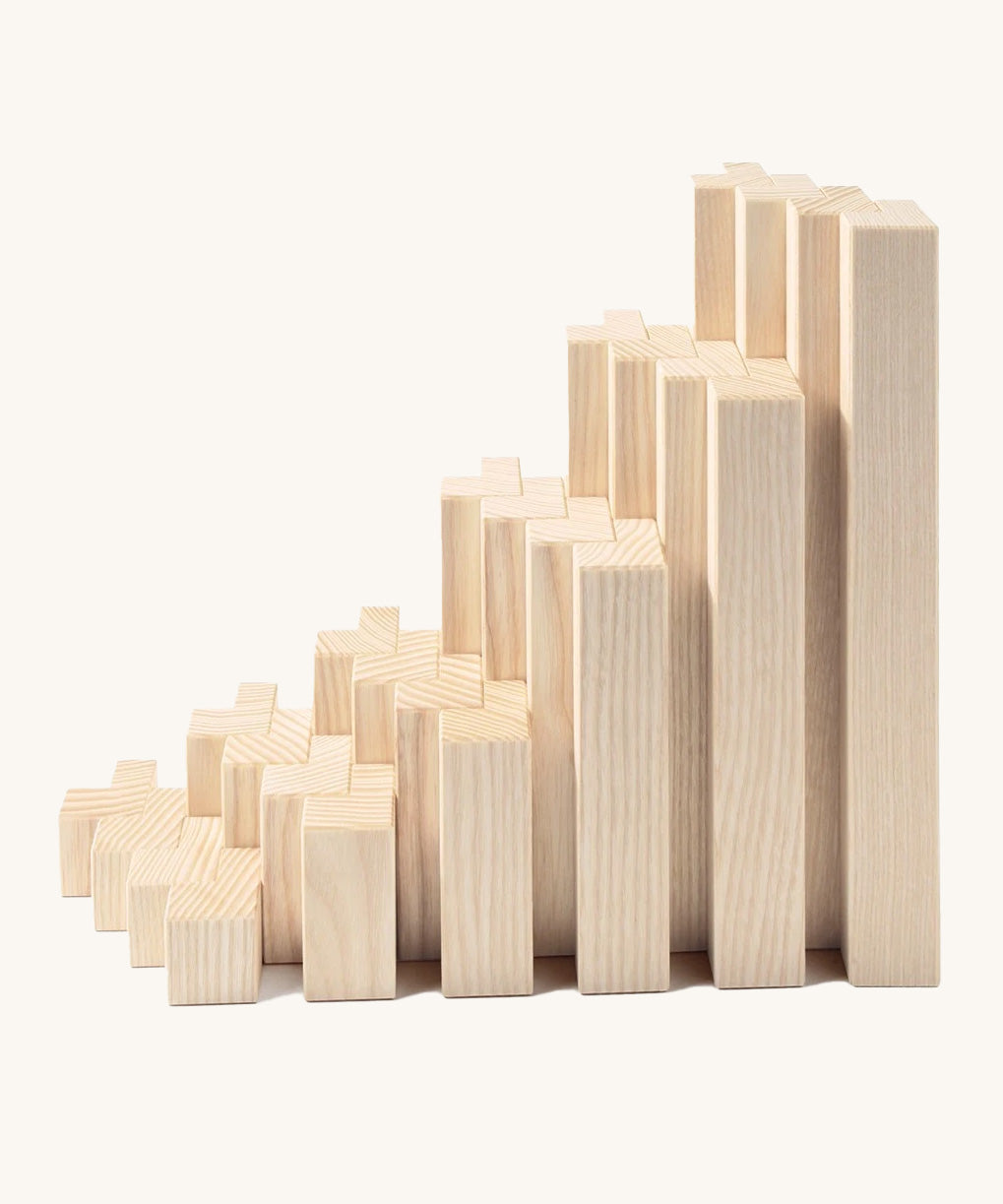 The elements combine to form endless creative structures, from bridges and towers to palaces and marble runs. Left in its natural state, the untreated white ash showcases the true beauty of the wood, with its fine grain and warm tone creating a pure, tactile building experience that celebrates the material’s organic character.