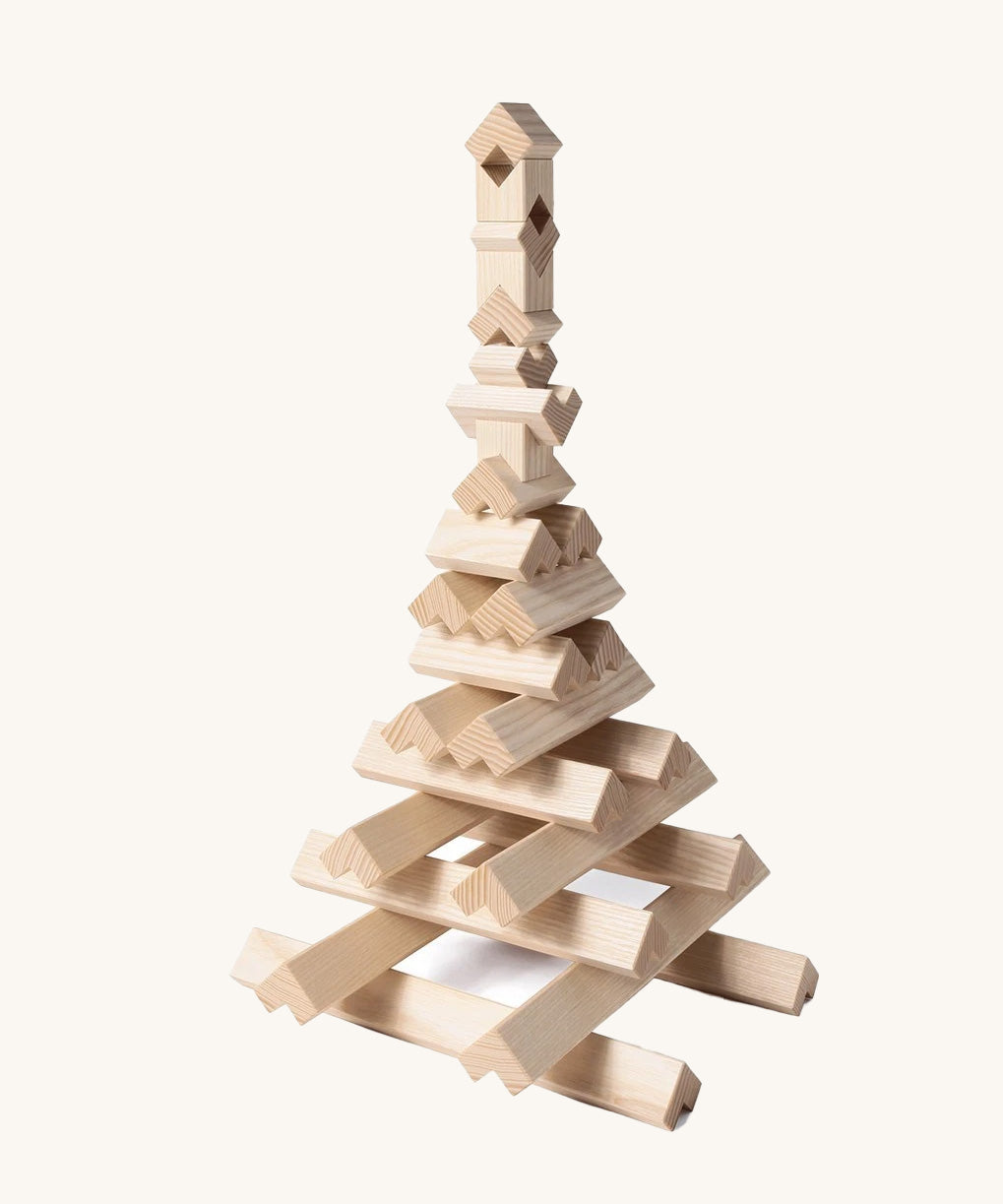 • A 32-piece geometric wooden stacking set for children and adults