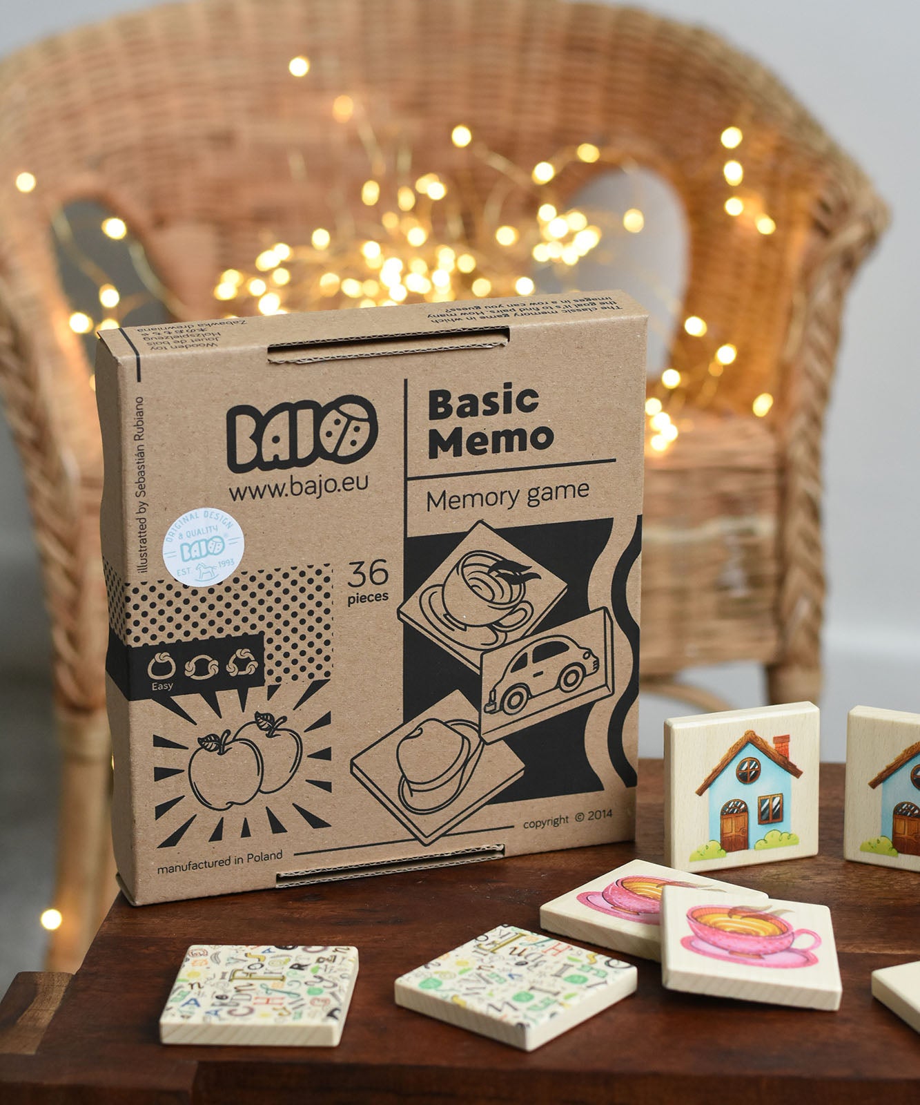 Bajo classic memory game available at Babipur. A 36 square tile matching game with various illustrations on the top side and letters and symbols on the underside.
