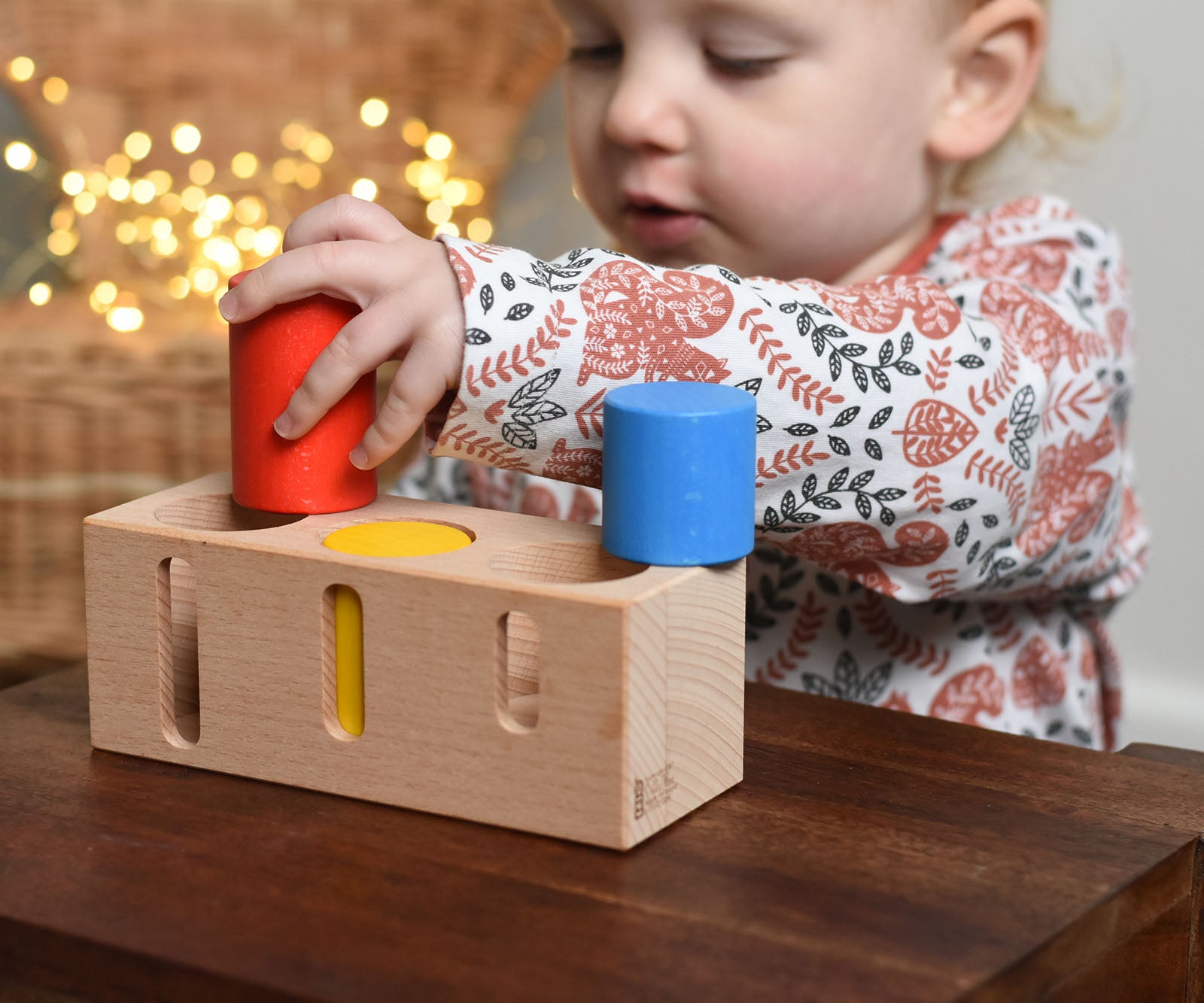 The set includes three solid wooden cylinders in primary colours (red, blue, and yellow) and a smooth natural wooden block with multiple sorting sides. One side features shallow, equal-depth holes for comparing cylinder height. Another has holes of different depths that match each cylinder perfectly, while the third side includes a clever window so children can see how far each piece goes inside.