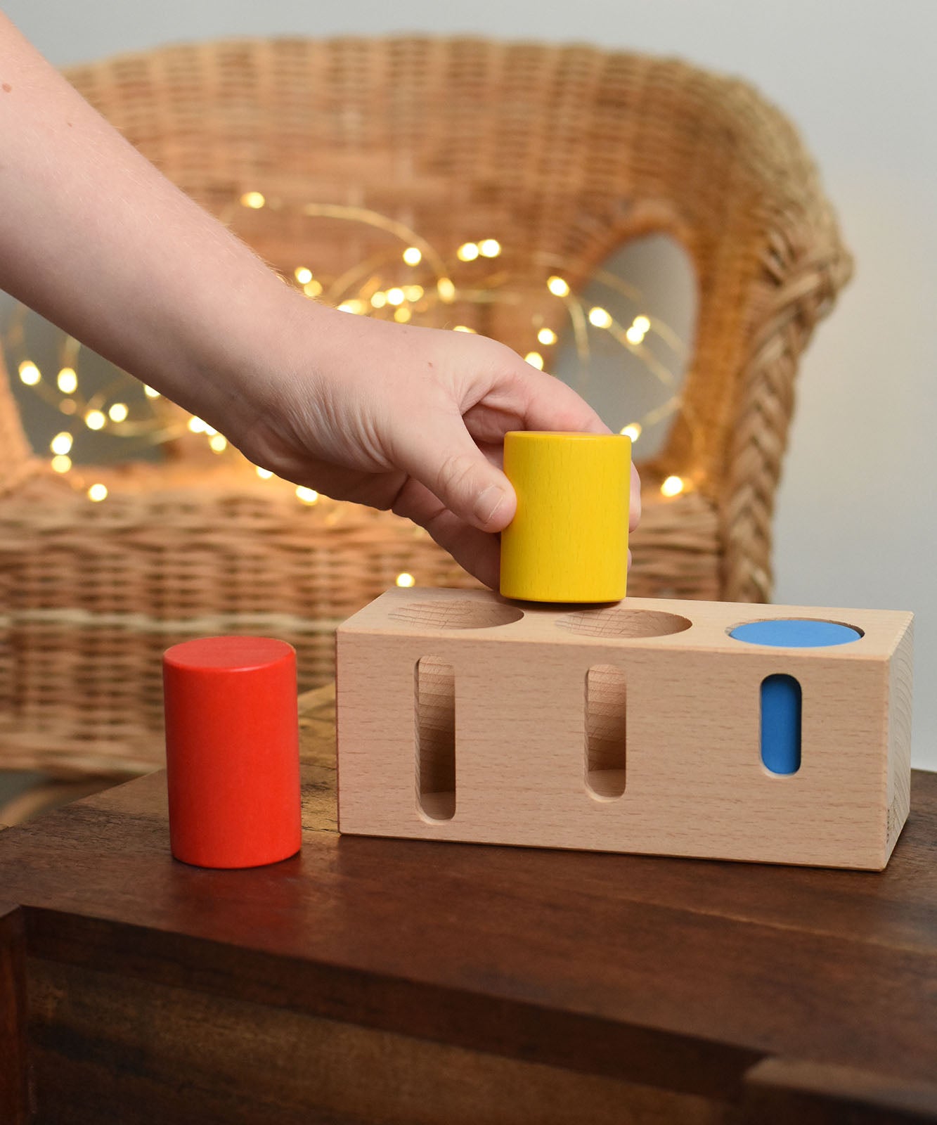 • Includes 3 coloured cylinders and 1 wooden sorting block