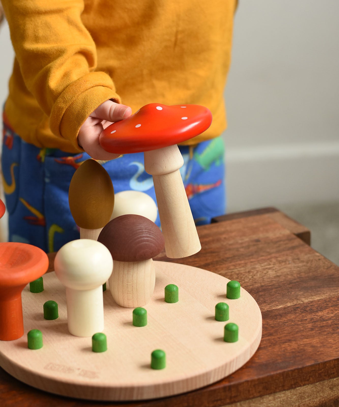 A child playing with the Bajo Wooden Mushroom Forest Peg Puzzle. The child is placing the red topped  mushroom on top of the white button mushroom. These heirloom quality toys by Bajo are part of a wide range of wooden toys available here at Babipur.