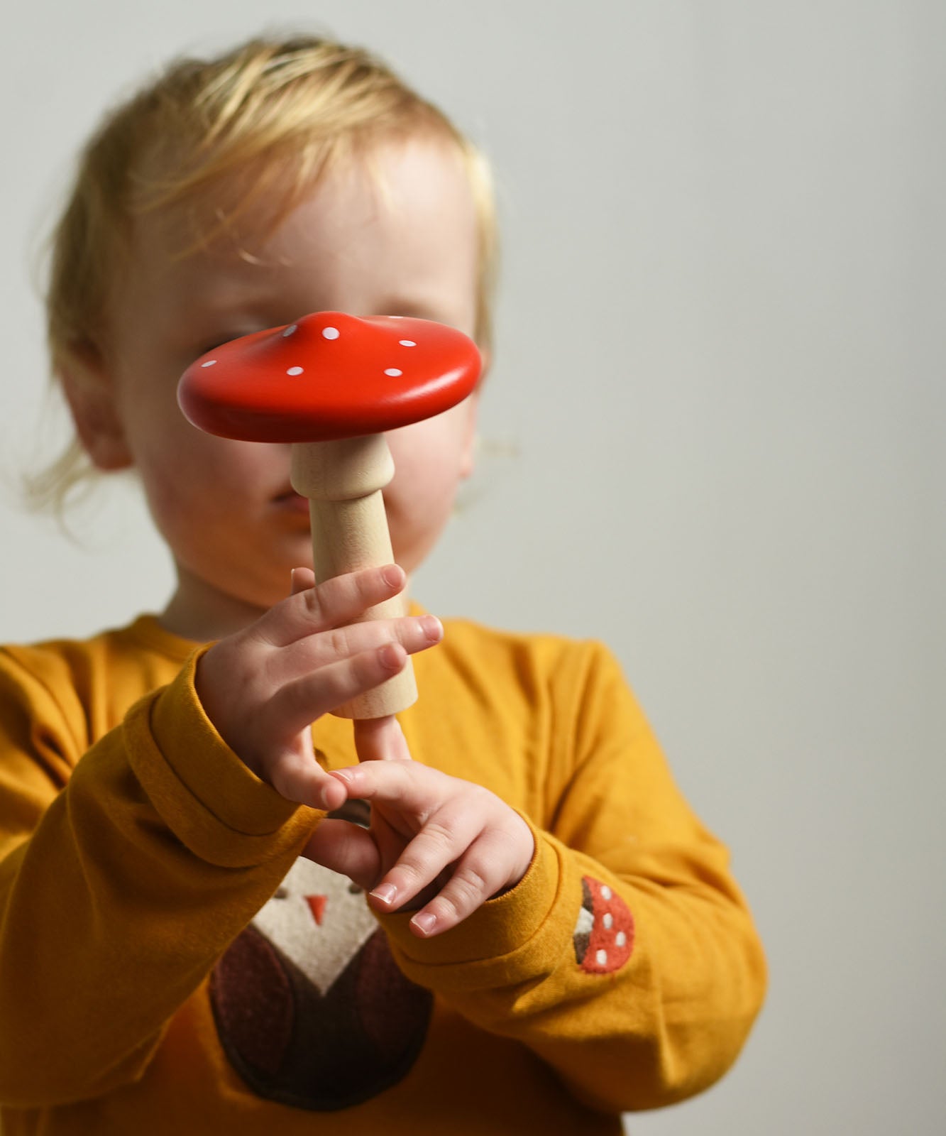 A child holding up the ref fly agaric mushroom from the Bajo Wooden Mushroom Forest Peg Puzzle in front of their face.  These heirloom quality toys by Bajo are part of a wide range of wooden toys available here at Babipur.