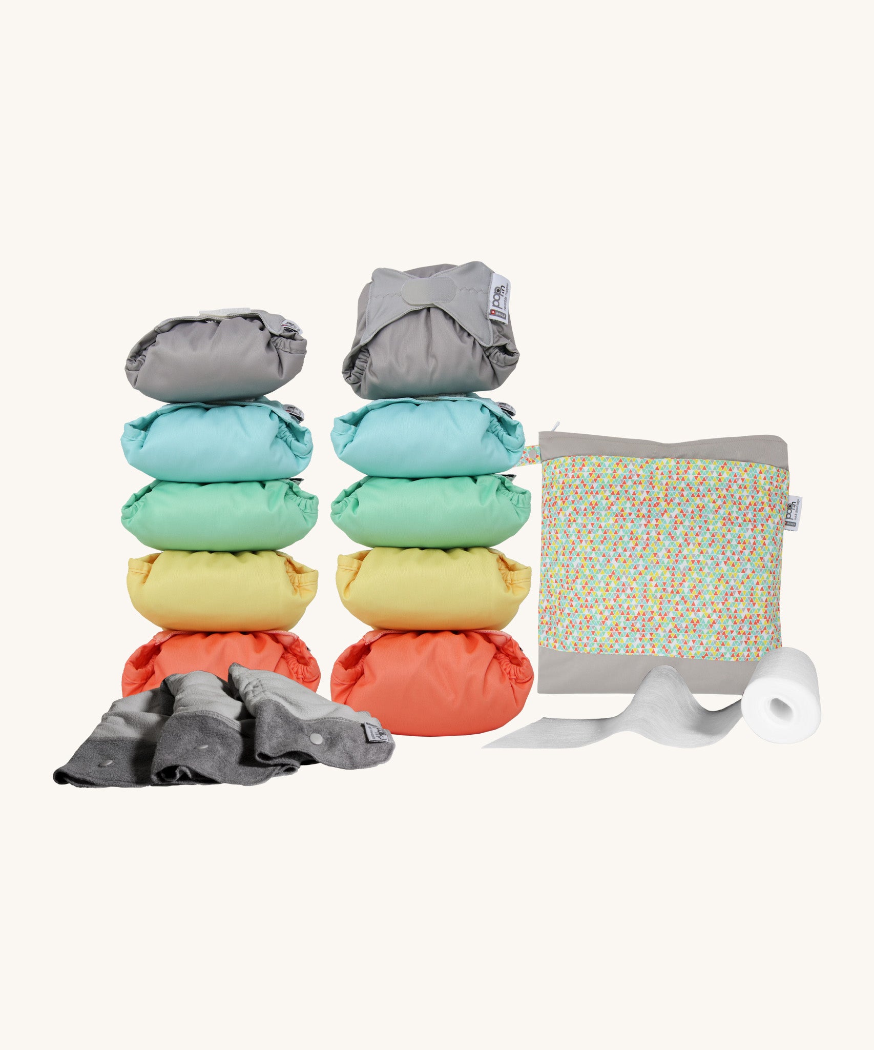 This is a perfect introductory pack to starting a zero waste reusable nappy journey making it a great gift. This new range features the most sustainable nappies so far, with each one having been made with 2 ½ plastic bottles. In a variety of new pastel colours including cloud, sky, coral, mint and sunshine, these nappies are onesize featuring a velcro closure and poppers on the front to adjust to fit your little one.