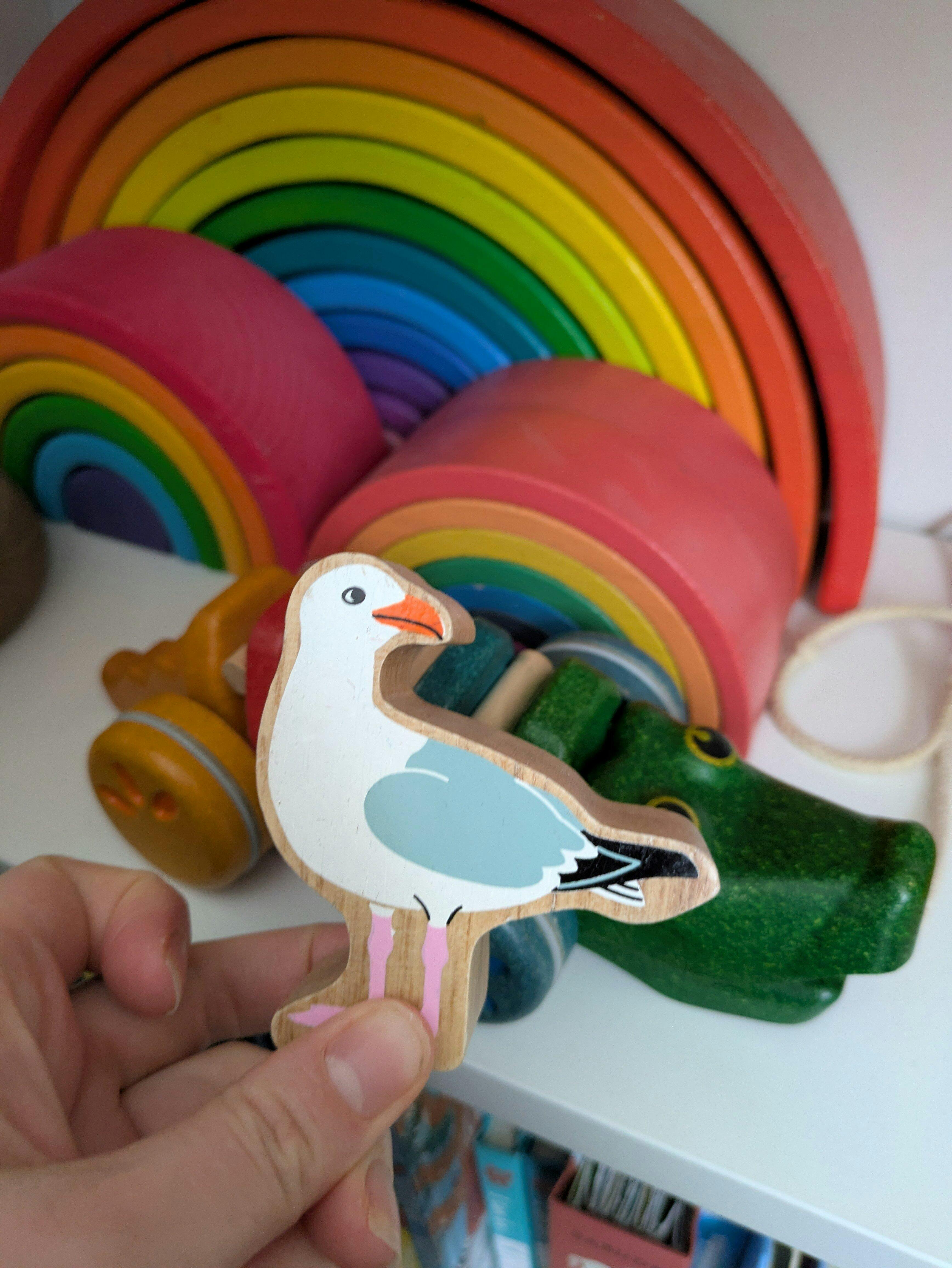 Perfect for adding to spring displays, this White Seagull from Lanka Kade features an inquisitive seagull, painted white, grey and black on the body, an orange little beak and pink legs and feet. Painted with non toxic colours on both sides, the edges of this sustainable wooden toy is left natural to show the beautiful wood grain underneath. This toy figure is a chunky size safe for little hands to explore and have fun setting up and stacking their own Spring Tables.