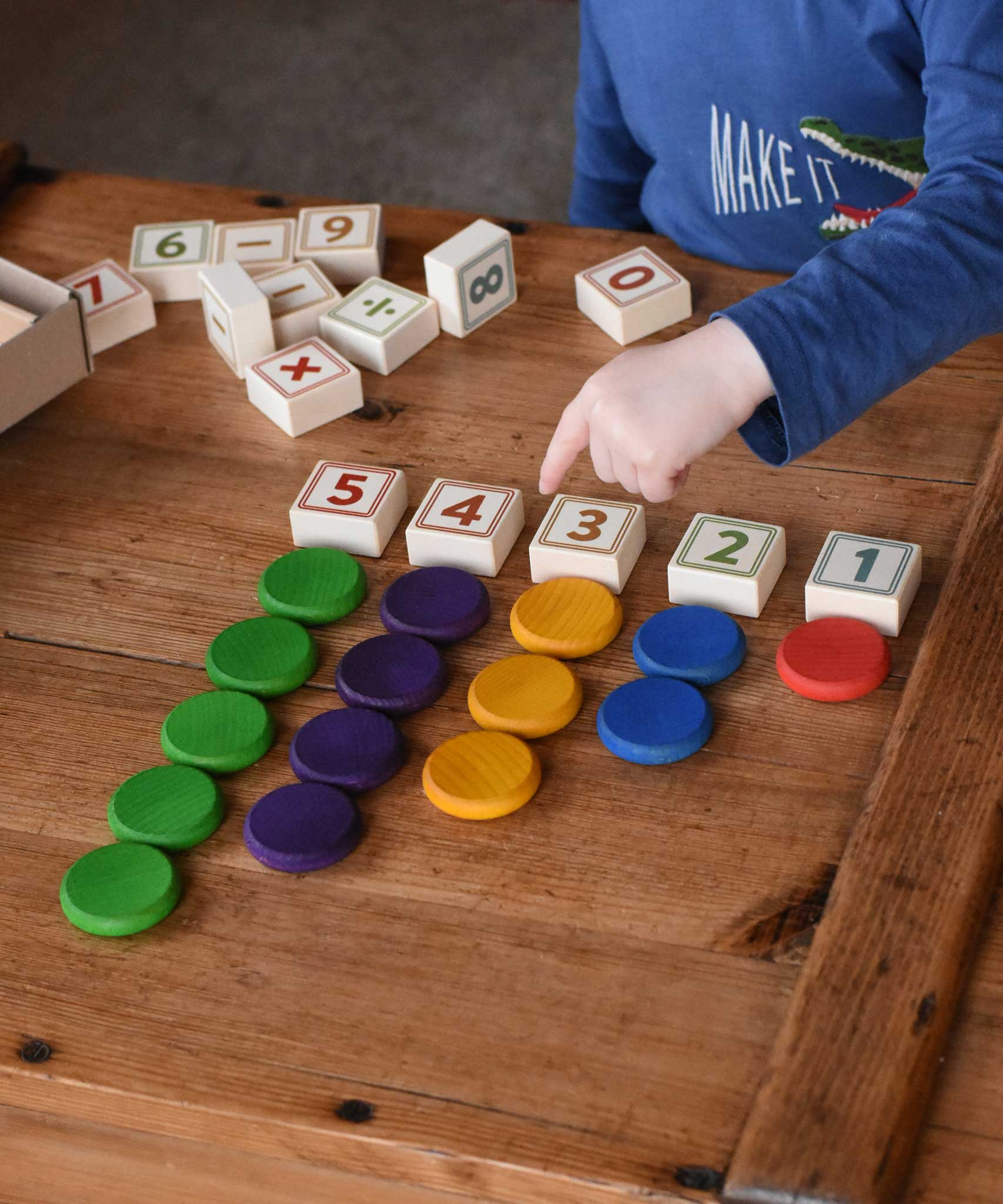 A child playing the blocks from the Bajo 40 Numbers & Symbols Blocks set. The 1 to 5 number blocks have been lined up with the corresponding number of Grapat wooden coins placed next to them. These heirloom quality toys by Bajo are part of a wide range of wooden toys available here at Babipur.