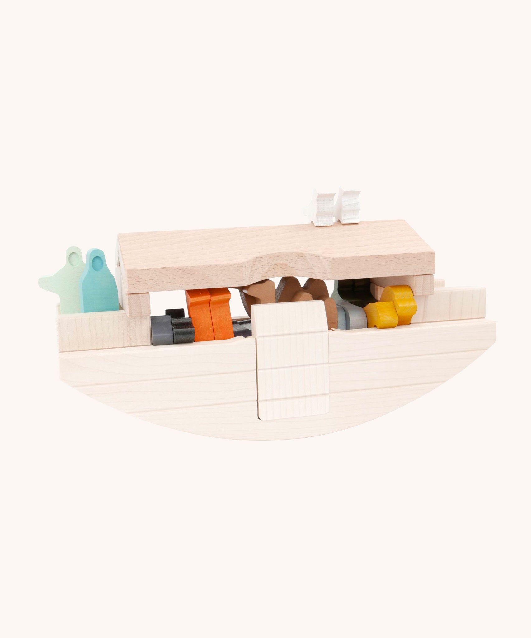 A contemporary wooden Noah's ark toy that looks fantastic and children will love playing with. The wooden ark has a roof that lifts off so that the nine animal pairs, plus Noah and his wife, can shelter inside. The ark is an impressive but manageable size and children will love to play with it - pairing the animals up, loading them on, and playing balancing games with the animals on the deck. There's an element of skill required to slot all the animals into place on the ark which adds another dimension to children's play. Team up with a Grimm's rainbow and act out the Bible story.