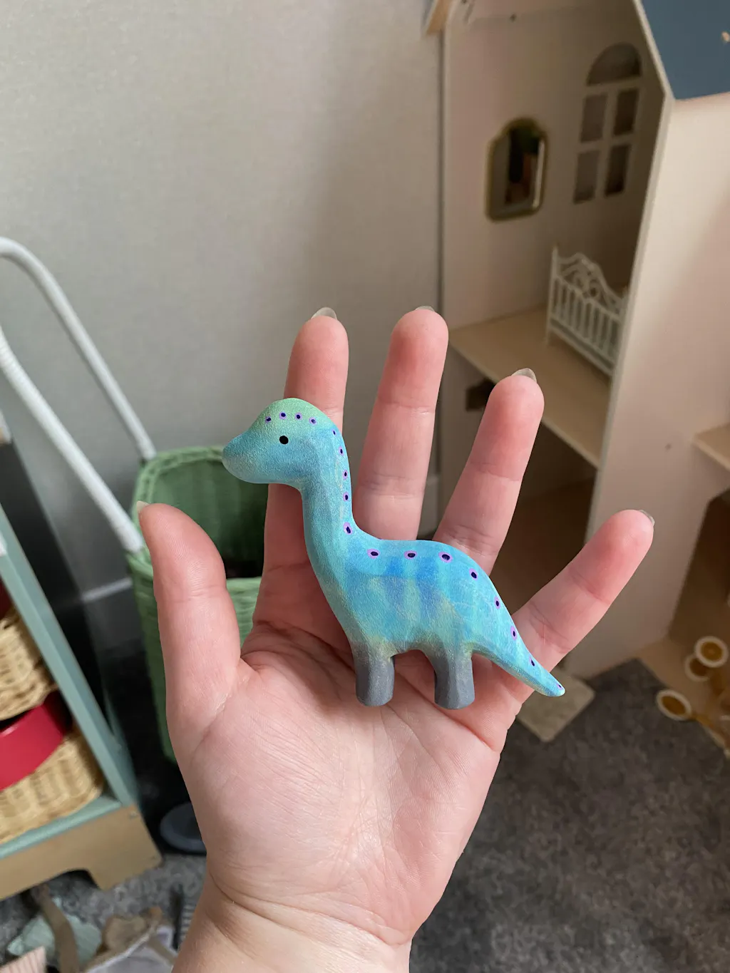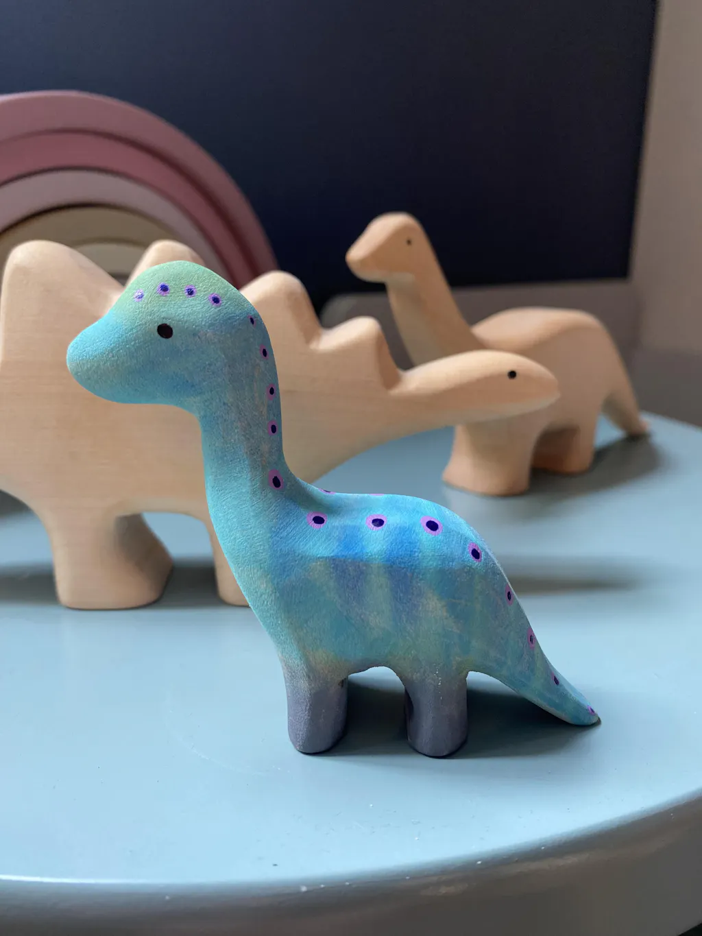 This adorable Baby Brontosaurus by Bumbu is a little long-necked wooden dinosaur figure, handmade and beautifully painted in blue with pink spots down its neck and tail. A stunning wooden dino figure for display and small-world play.