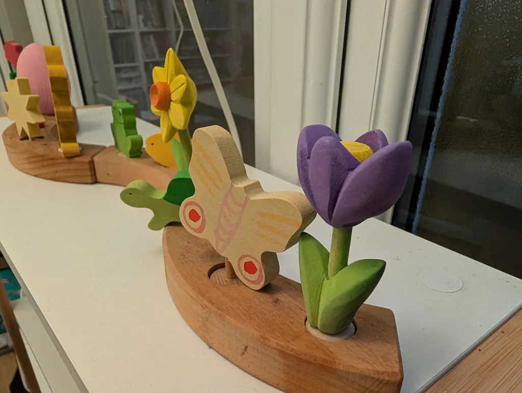 Each flower includes both a removable peg base (17mm diameter) to fit Grimm’s celebration rings and spirals, and a flat green stand, allowing it to be displayed upright in small world play scenes or seasonal toy setups.
