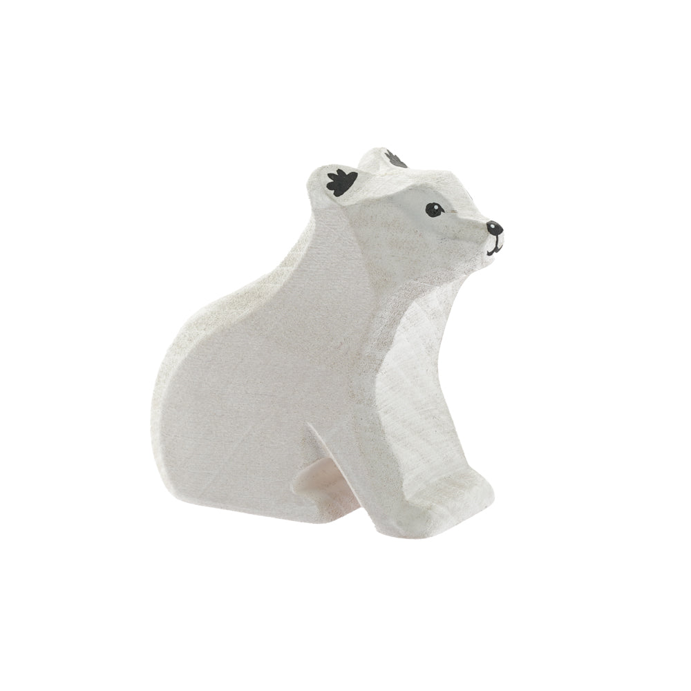 Bumbu childrens hand carved sitting baby polar bear toy on a white background