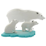 Bumbu large polar bear and 2 small polar bear cub toys stood on the wooden ice floe block on a white background