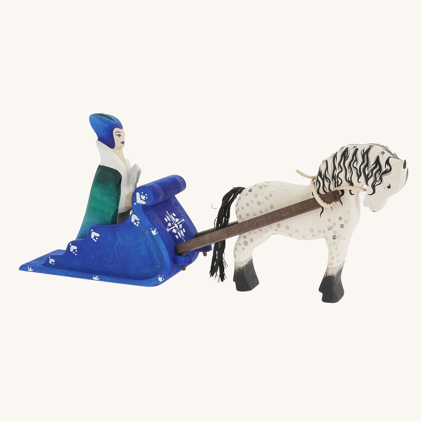 The Bumbu Snow Queen, Sleigh & Horse Set is a fabulous handmade 3-piece wooden play set based on the story of The Snow Queen by Hans Christian Andersen, and includes the Snow Queen, a wooden sleigh, and a white horse figure with a dappled white body, flowing black mane and tail and smart black socks.