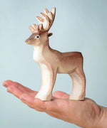 A Bumbu Toys Reindeer placed in the palm of an adult's hand.