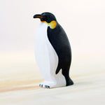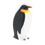 The Bumbu Female Emperor Penguin is a handmade wooden animal figure with a black and white body with orange detailing on the beak and neck.