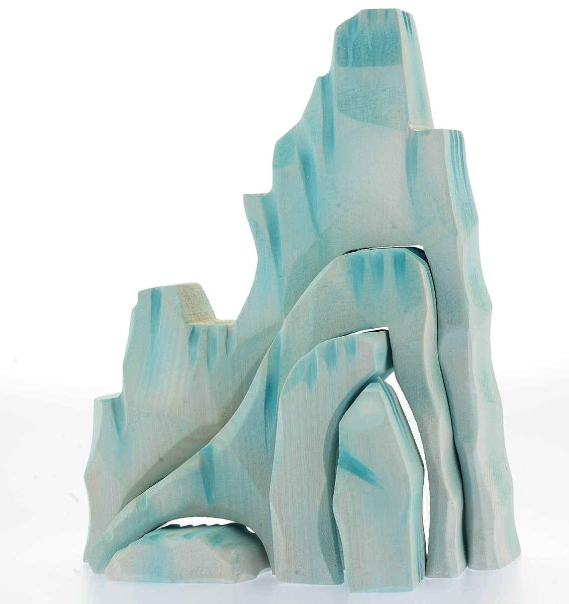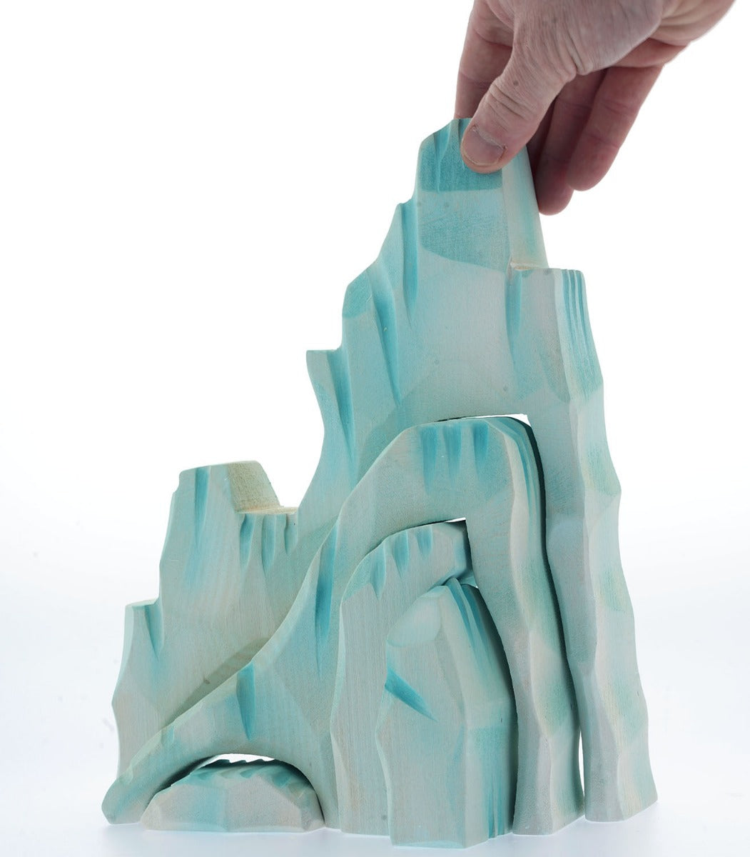 The Bumbu Icy Cliffs is a set of 5 handmade wooden blocks that stack together to make a magnificent icy mountain scene. Hand carved and painted in shades of white and blue to represent glaciers, steep icy cliffs, icebergs, icy caves and ravines. The Icy Cliffs Set is perfect for creating polar scenes and for arctic-themed small world play.