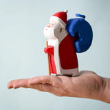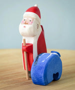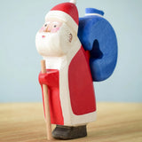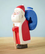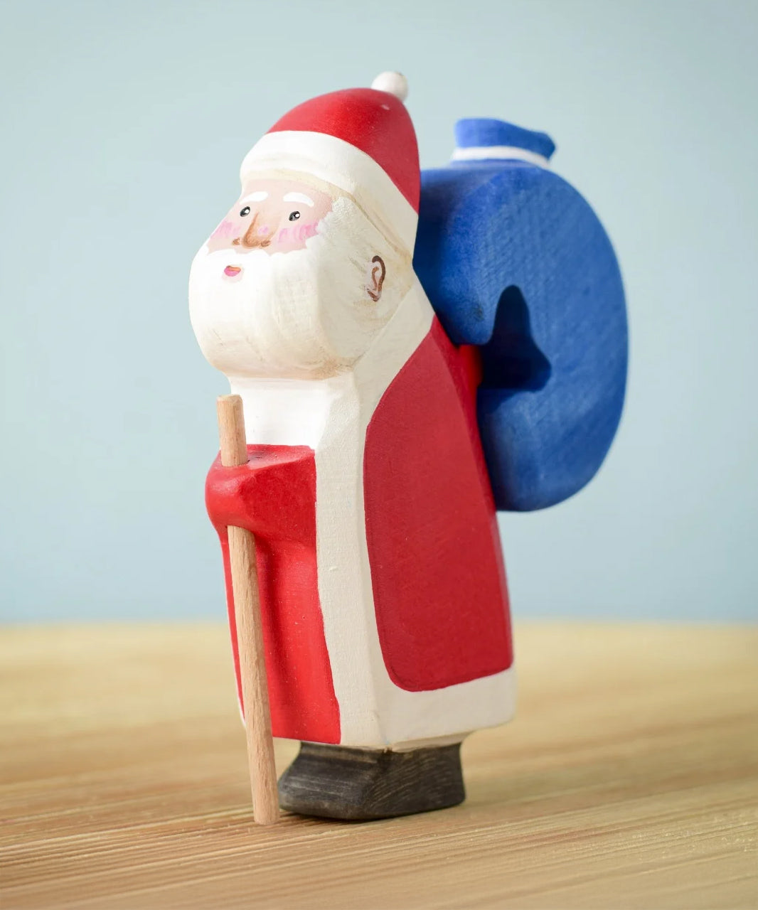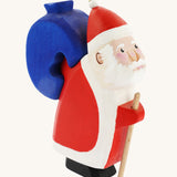 Bumbu Wooden Santa Claus, is a handmade and hand painted festive toy figure with a wooden blue sack that can be removed from its back. The image shows Santa with rosy cheeks, a beard, a red and white outfit and a red and white hat, with the blue wooden sack on his back. The image is on a cream background