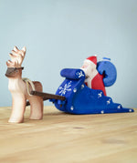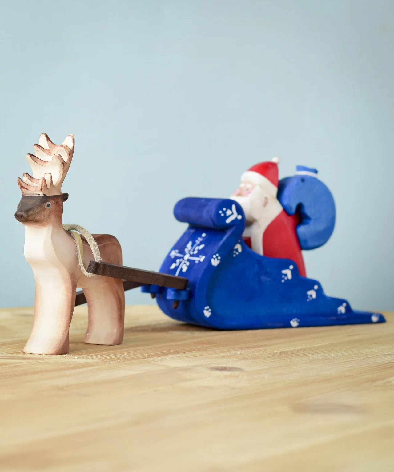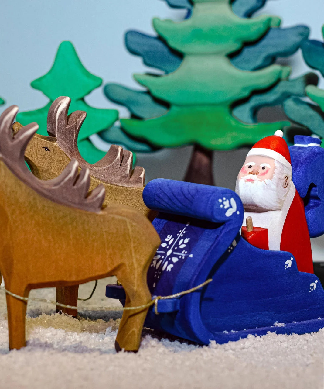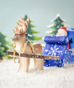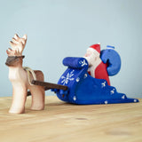 Bumbu Santa sitting in the back of the Snow Sleigh with a blue wooden sack on his back, and a Reindeer attached to the reins of the sleigh