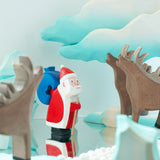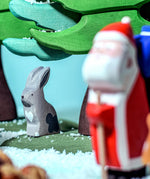 The Bumbu Wooden Santa toy is in the woods with woodland animals which include a Bumbu rabbit, a Bumbu deer and green trees in the background