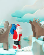 Bumbu children's wooden Father Christmas figure stood on a mirror next to some Bumbu stags and a winter Maple tree