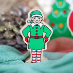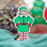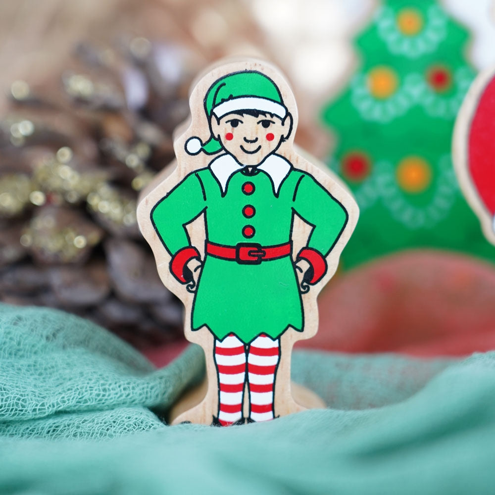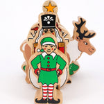 This wonderfully festive Lanka Kade Elf is the perfect chunky size for little hands to play with and set up their own Christmas scenes. This cheerful wooden Elf figure has been busy making toys in the workshop, and is wearing a green hat and tunic, stripy red and white leggings and pixie boots.