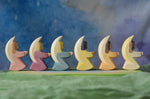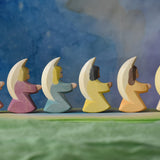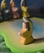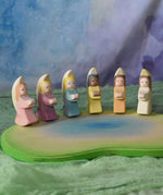 A host of little Ostheimer angels placed on a pond scene piece in a small world play set up. These little angel figures all have different coloured dresses, white, yellow, orange, purple, pink and blue with moon shaped wings. These wooden figures are part of a wide range of expertly hand crafted wooden toys here at Babipur.