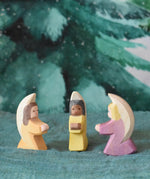 A group of three little wooden angels placed on an Ostheimer pond piece in a small world scene set up. These wooden figures are part of a wide range of expertly hand crafted wooden toys here at Babipur.