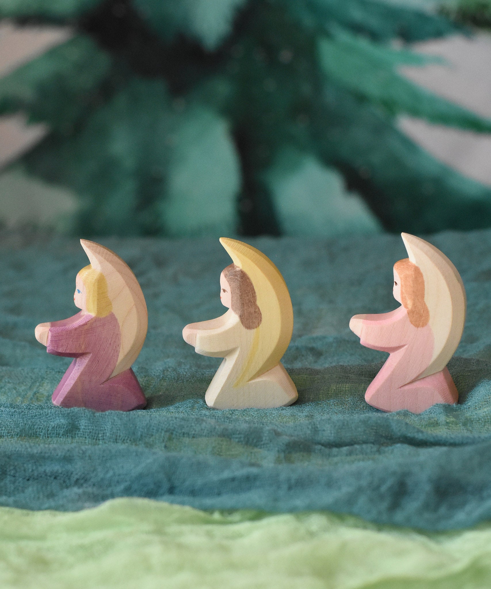 Three little Ostheimer angels lined up and placed on green coloured decorative Ostheimer scarfs. These wooden figures are part of a wide range of expertly hand crafted wooden toys here at Babipur.
