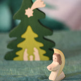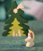 An Ostheimer little angel figure with white outfit placed at the front of small world play scene. There is a Bumbu nativity scene tree in the background. These wooden figures are part of a wide range of expertly hand crafted wooden toys here at Babipur.