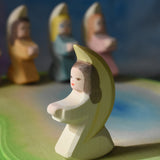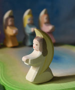 A host of little Ostheimer angels placed on a pond scene piece in a small world play set up. These little angel figures all have different coloured dresses, white, yellow, orange, purple, pink and blue with moon shaped wings. These wooden figures are part of a wide range of expertly hand crafted wooden toys here at Babipur.
