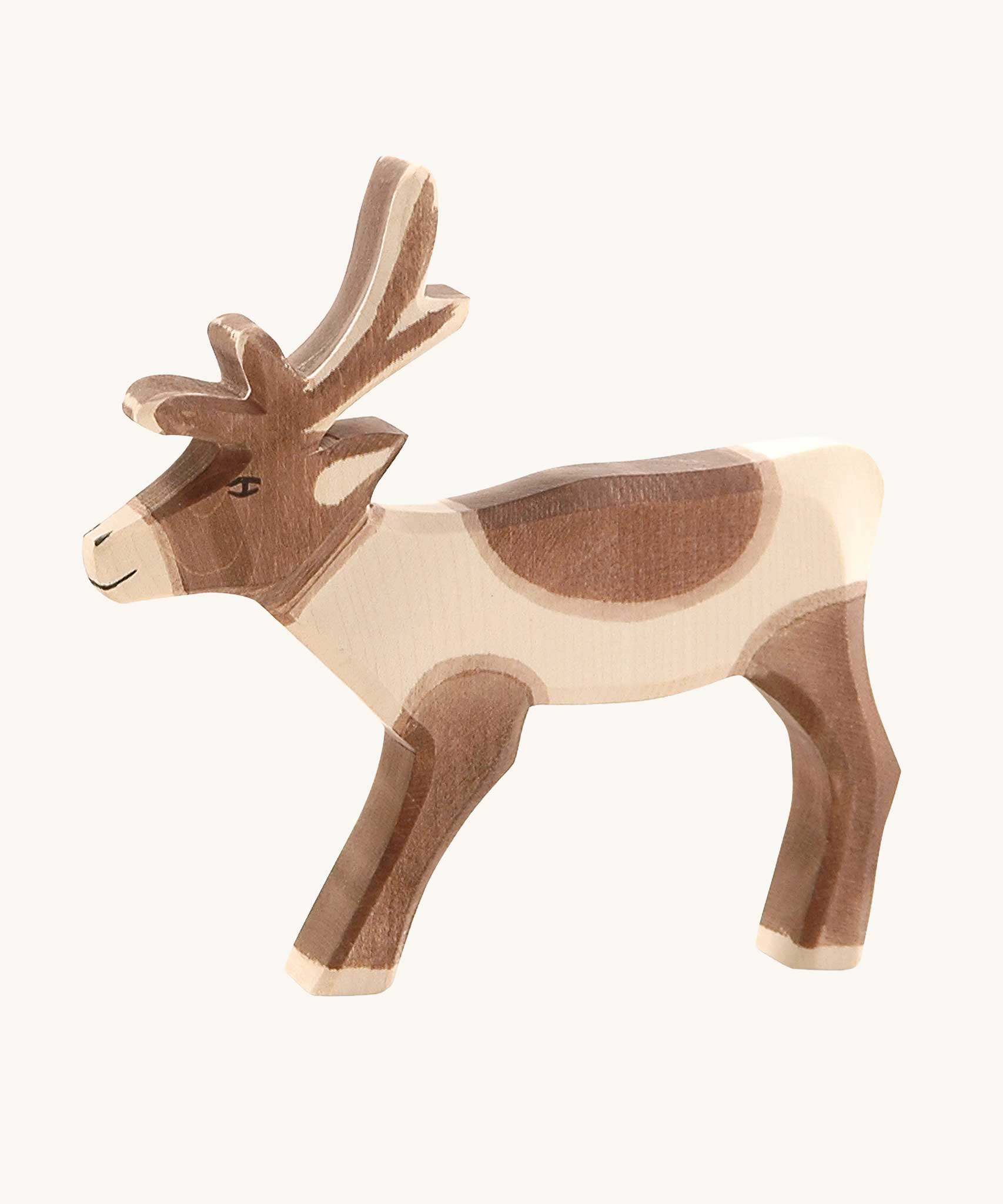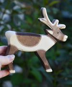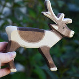 The Ostheimer reindder figure shown in an adult's hand for scale. Check out our full range of expertly crafted wooden toy figures and scenery here at Babipur.
