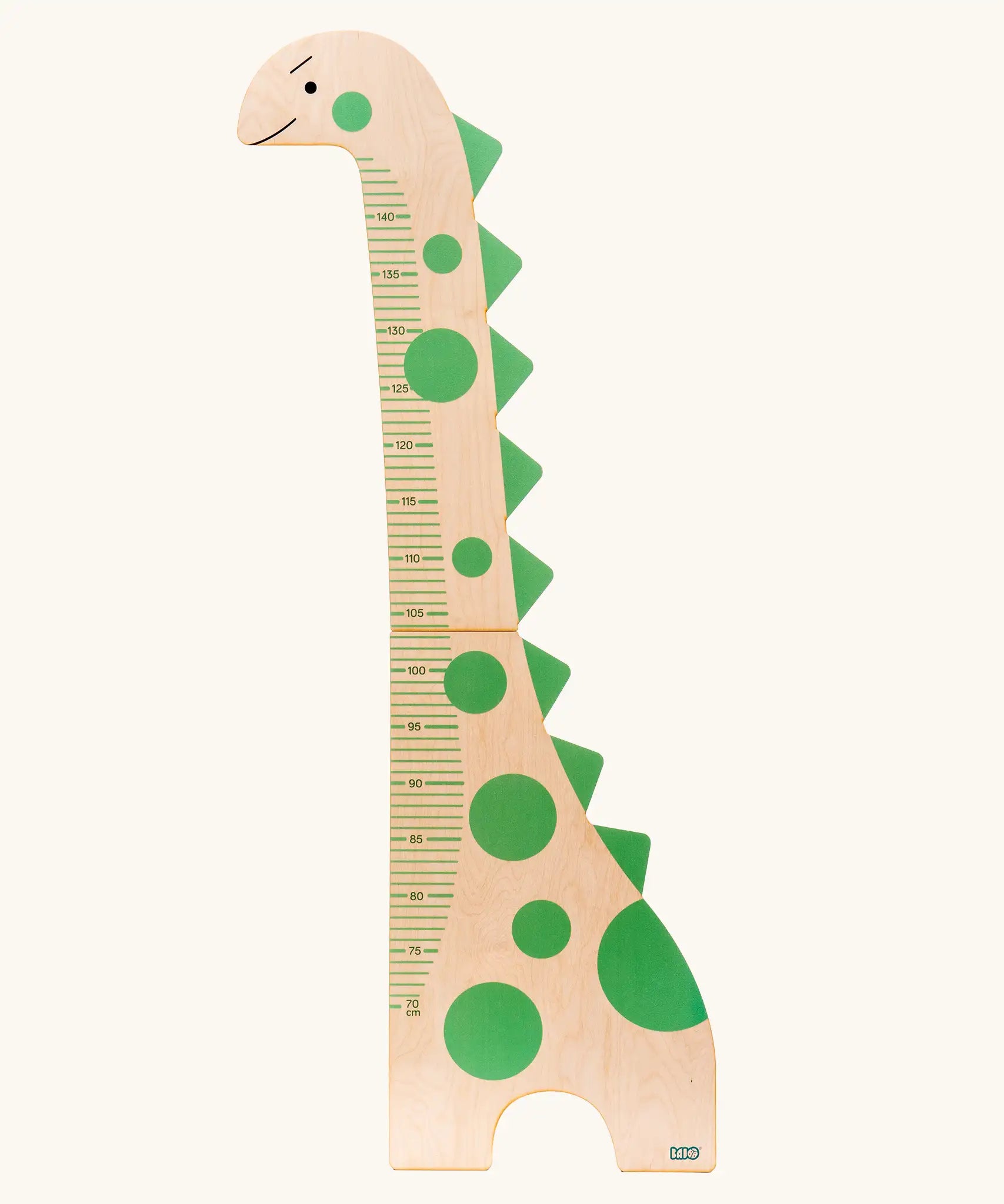 Bajo dinosaur measuring growth chart. A natural wooden dinosaur decorated with green dots and spikes down it's neck and back.