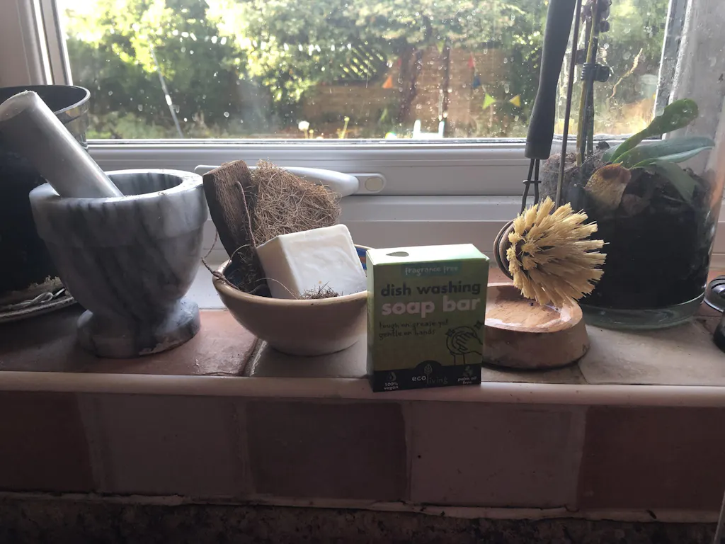 • Plastic-free - solid bar alternative to bottled liquid dish soap.