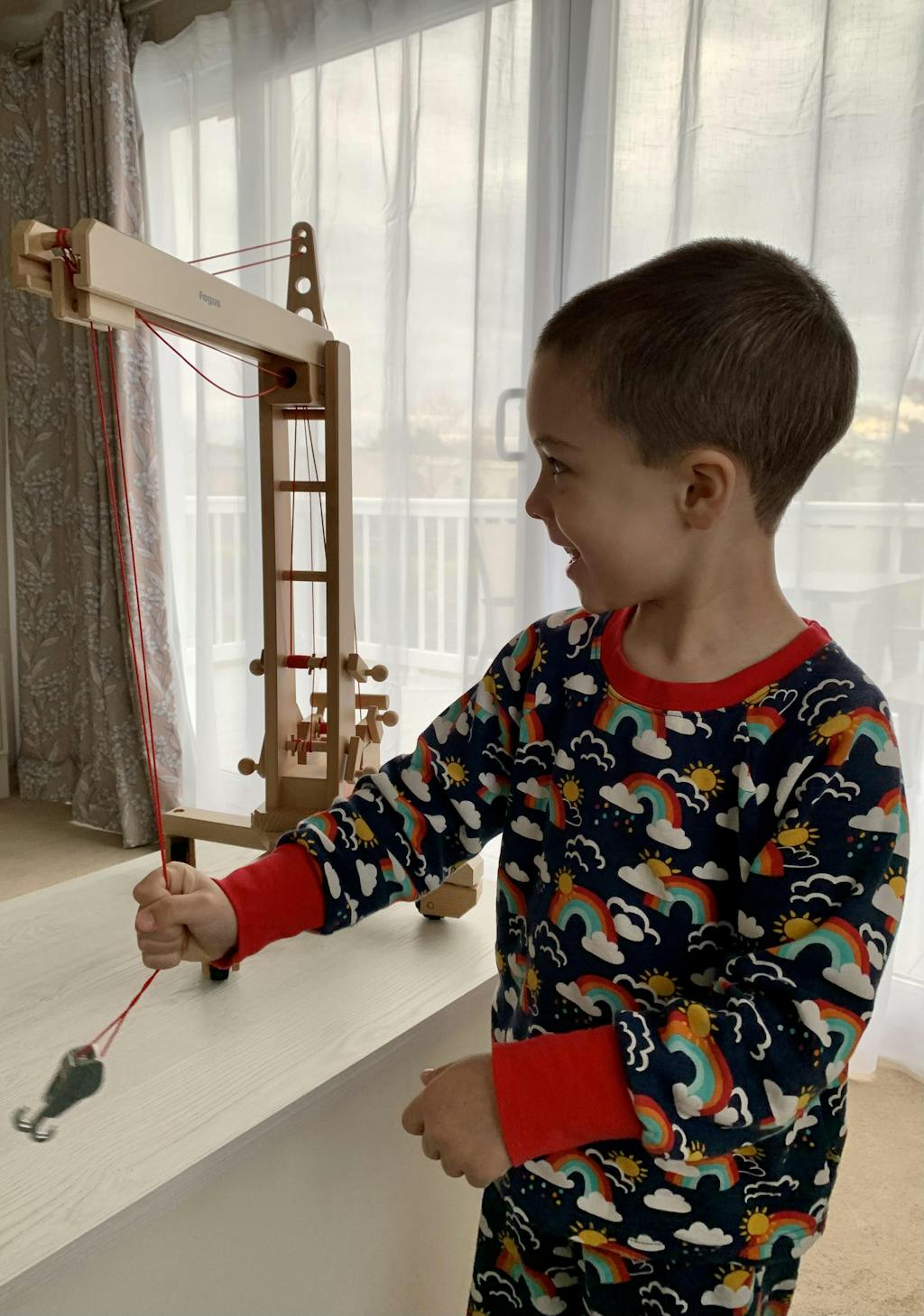 Child playing with the Fagus eco-friendly wooden crane toy on a white background