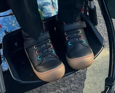 We got these to go over my son’s splints, the fit really well, even the velcro strap is long enough to close without leaving the sticky velcro exposed to pick up fluff. My son wears these for school, and despite the tiny amount of colour the school are fine with these as school shoes. I love that the shoes have soft flexible soles and a bit more character than most boys school shoes.
